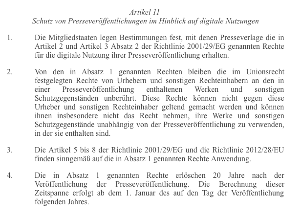 - Artikel 11 bezieht sich auf das Leistungsschutzrecht („Schutz von Presseveröffentlichungen“).