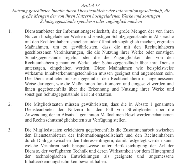 - Der Artikel 13 ist Teil der Urheberrechtsreform der Europäischen Union. Die Urheberrechtsreform wird stark kritisiert, besonders der Artikel 11 und der Artikel 13. In vielen Ländern der EU gab es Demonstrationen und laute Proteste. EUR-Lex (bis dato noch keine offizielle konsolidierte Fassung inkl. der Erwägungsgründe 37, 38, 39)